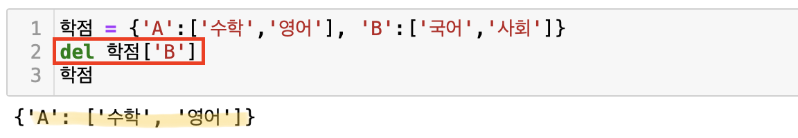 딕셔너리에 있는 특정 요소를 삭제할 때는 del를 이용하면 된다. del 변수[key]를 입력하면 그 key에 해당하는 value가 삭제된다.