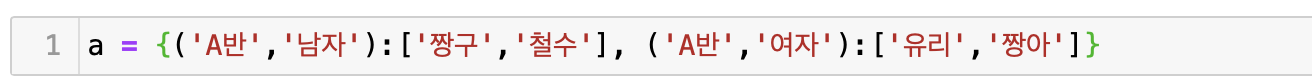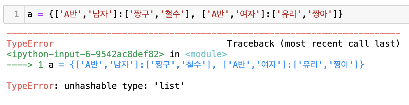 딕셔너리를 사용할 때 또 한 가지 주의할 점은 key에는 리스트 형태가 올 수 없다는 것이다. 하지만 튜플은 key로 사용할 수 있다. 그 이유는 저번 시간에 정리했듯 리스트는 그 값을 수정할 수 있지만 튜플은 그 값이 한번 선언되면 변경될 수 없기 때문이다.