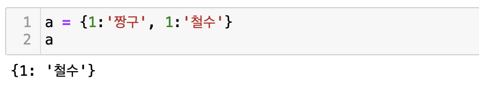 위에서도 언급했듯, key는 고유한 값이므로, 중복되는 key를 사용할 수 없다. 따라서 이미 사용 중인 key에 중복되는 key를 설정하게 되면 그 전의 key가 무시되어버린다. 그 이유는 딕셔너리는 key를 통해서 value값을 추출해내는 특성이 있는데, 동일한 key가 존재하게 되면 추출할 때 어떤 value를 추출해야 하는지 알 수 없기 때문이다.