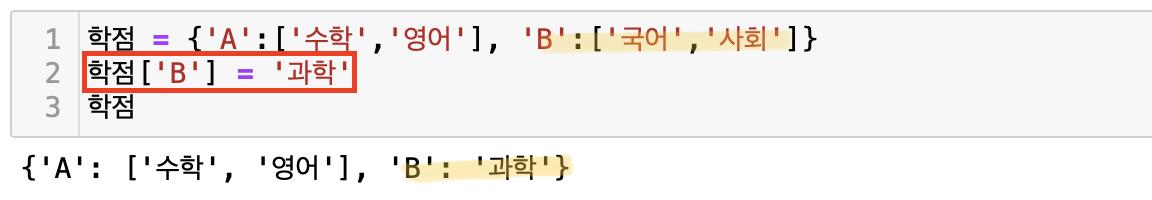 딕셔너리에 있는 특정 부분을 수정하고 싶다면 변수 [key] = 변경할 value 를 입력해주면 된다. 위의 예시를 보면, 학점['B']에 해당되는 과목을 '과학'으로 수정하고 싶다. 따라서 학점['B'] = '과학'을 입력하고 다시 변수 '학점'을 출력해보면 학점 B에 해당되는 value가 수정되었음을 알 수 있다.