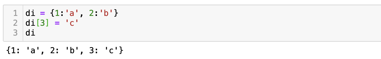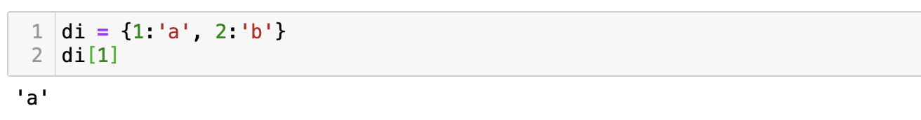 먼저 변수 di에 {1: 'a', 2:'b'} 딕셔너리를 선언한 다음, di[1]을 출력해보면 'a'가 출력된다. 여기에서 di[1]이 의미하는 것은 리스트나 튜플에서 항상 해왔던 인덱싱이나 슬라이싱의 [1]이 아니다. 즉, 1번째에 있는 값을 출력해라 라는 의미가 아니라는 것을 주의해야 한다. 딕셔너리에서 [ ] 안의 숫자는 key에 해당하는 숫자일 뿐이다.