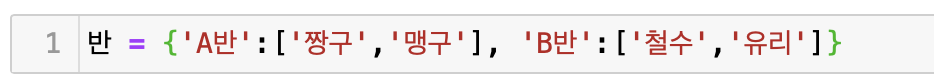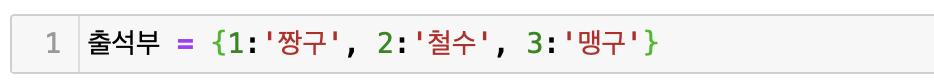 key에는 변하지 않는 값을 써주며 중복이 불가하다. 반면 value에는 변하는 값과 변하지 않는 값 모두를 사용할 수 있다. 위의 예시를 보자면, 변수 출석부에 1번은 '짱구', 2번은'철수' 3번에는 '맹구'의 값이 각각 쌍을 이루어 선언된 것이다.