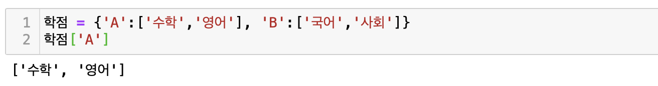 리스트와 튜플은 인덱싱이나 슬라이싱을 이용하여 그 주소에 있는 값을 추출해왔다면, 딕셔너리는 key를 이용하여 그에 해당하는 value를 얻는 방식으로 값을 출력한다.