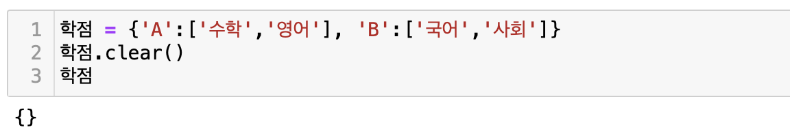 clear( )함수는 딕셔너리 안의 모든 요소들을 삭제한다.