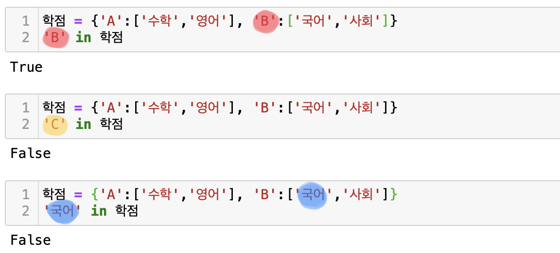 딕셔너리에 해당 key가 있을 때 in을 사용하여 알아볼 수 있다. key in 변수 의 형태로 입력한 다음 출력해 봤을 때, 해당 key가 딕셔너리에 있다면 True, 없다면 False를 출력한다. 여기서 주의할 점은 values의 값을 확인하는 것은 해당되지 않는다는 점이다.