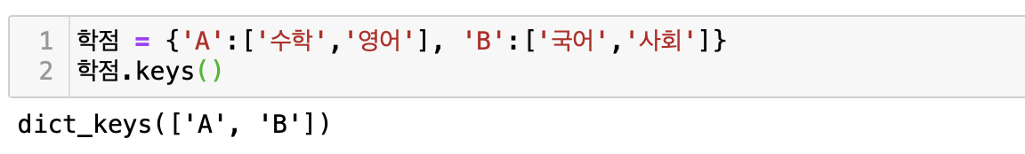 2) 딕셔너리에 있는 모든 key값 가져오기 : .keys( )