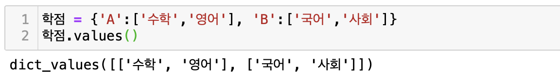 .values( )를 이용하면 딕셔너리에 포함된 모든 value값을 출력할 수 있다.