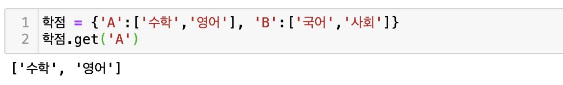 value를 추출하는 방법은 2가지가 있는데 그중 첫 번째는 대괄호[ ]를 이용하는 것이다. 변수[key]를 적어주면 그 key에 대응하는 value를 찾을 수 있다. 예를 들어, 학점을 딕셔너리 형태로 A와 B학점에 해당하는 과목들을 대응시켰다. 그 뒤 학점['A'] 즉, 학점 중에서 'A'를 맞은 과목들을 출력했을 때 그에 해당되는 값인 ['수학', '영어']가 출력됨을 알 수 있다.