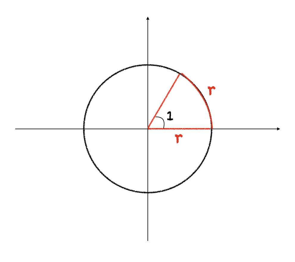2) 반지름의 길이(r)와 호의 길이를 동일하게 만드는 각을 '1(실수)'이라고 표현
