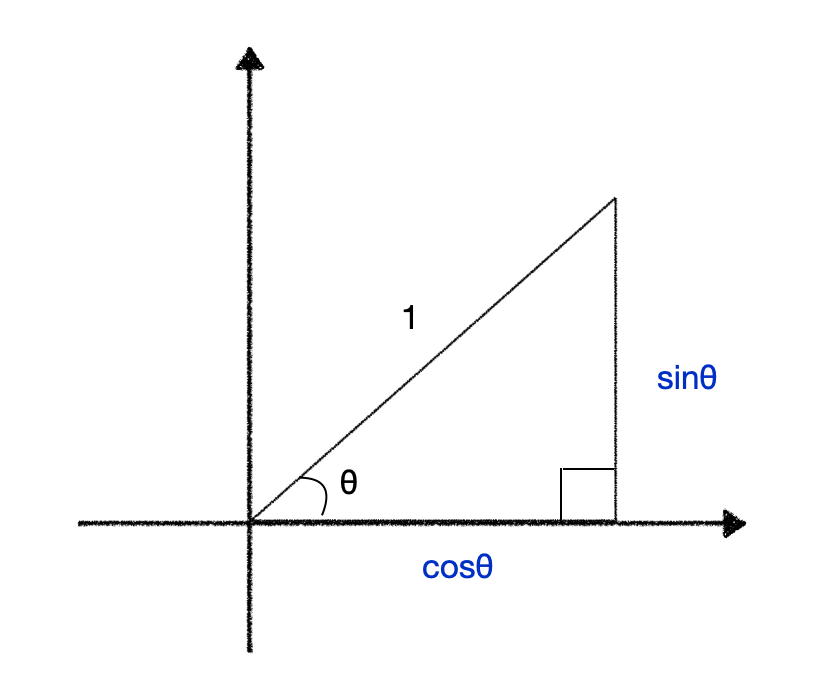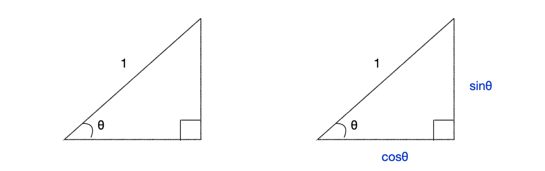나머지 두 변의 길이는 각각 cosθ와 sinθ가 된다.