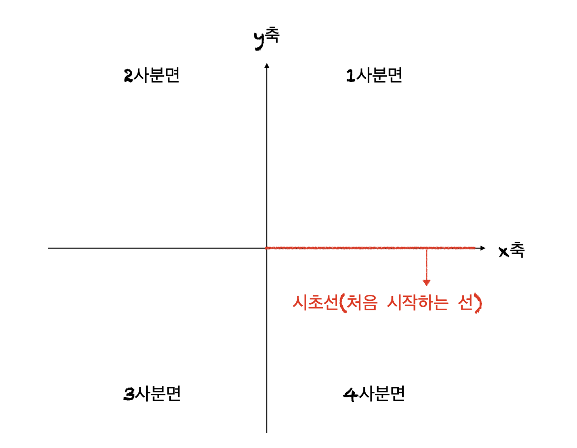 좌표 평면상에 1 사분면, 2 사분면, 3 사분면, 4 사분면, x축, y축 그리고 시초선이 있다.